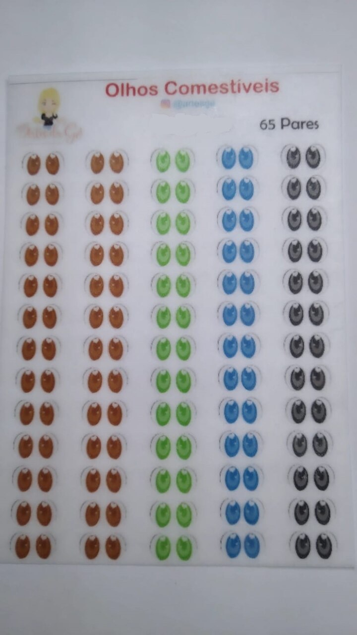 Cartela de comestíveis com 65 pares produzidos em papel de arroz para aplicação em doces de pasta americana e de leite ninho.